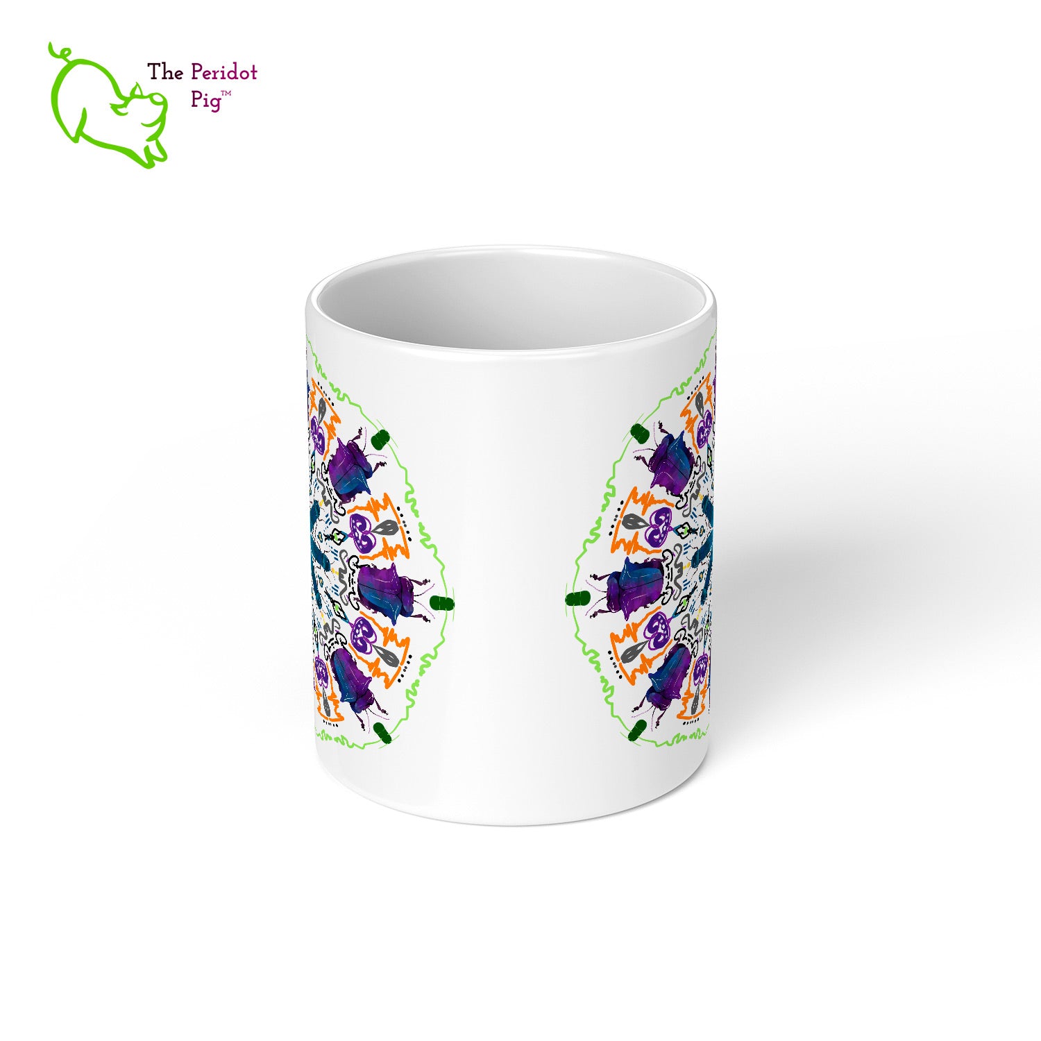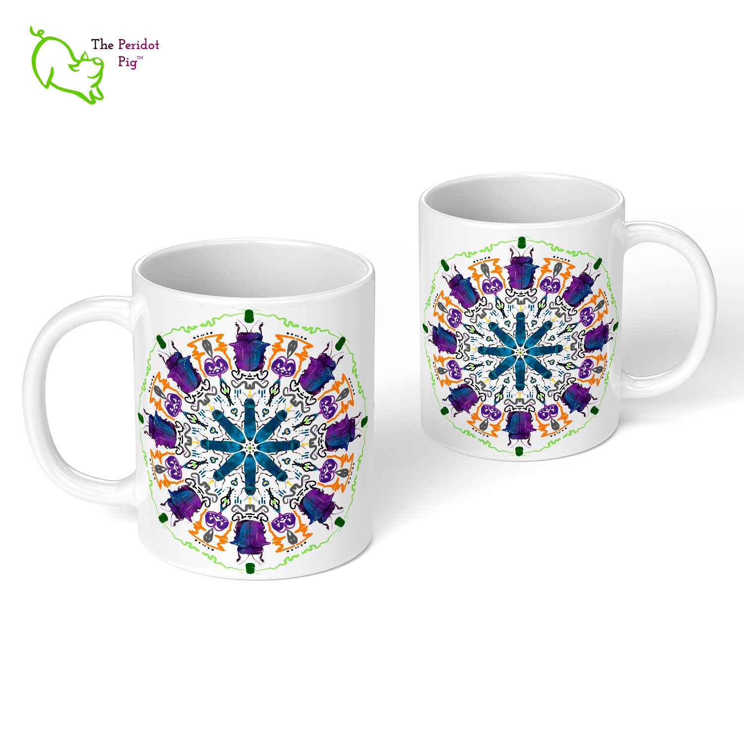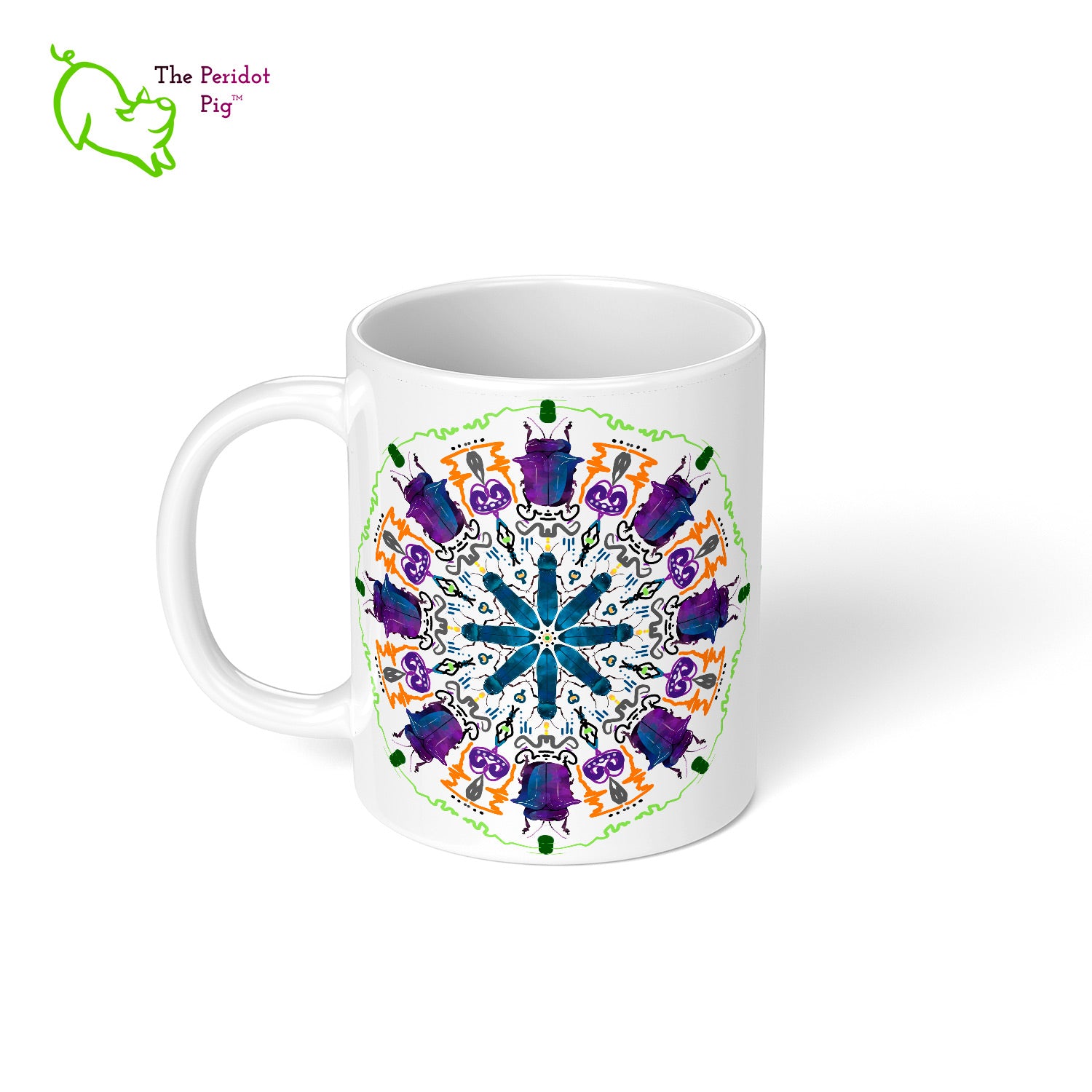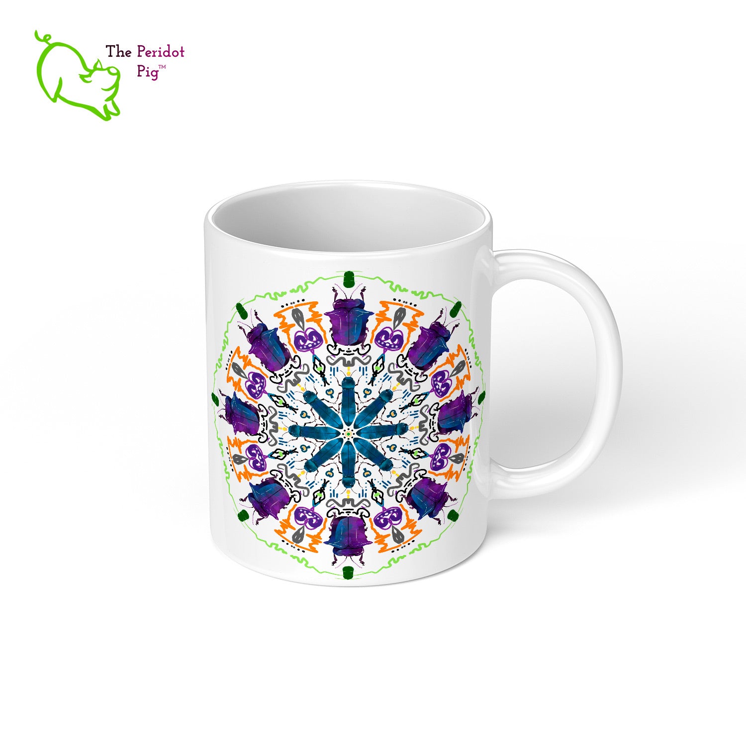 A colorful mandala of beetles graces this 11 oz mug. The larger beetle has shades of violet and blue. The smaller beetle is in a delicate shade of blue. Printed on a glossy white mug, these bugs really pop! Start your day with something a little bit different.