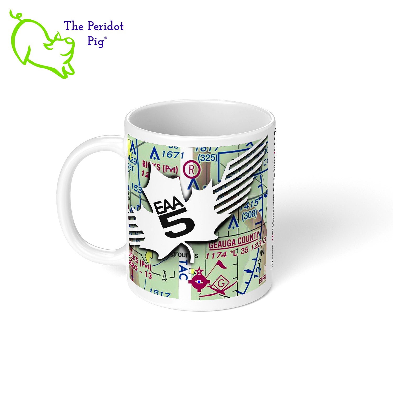 The perfect coffee mug for the EAA Chapter 5 member or fan. These glossy white mugs are printed with a snapshot of a Geauga County aeronautical chart with the EAA Chapter 5 logo and URL on top. Printed using vibrant color in a permanent ink.