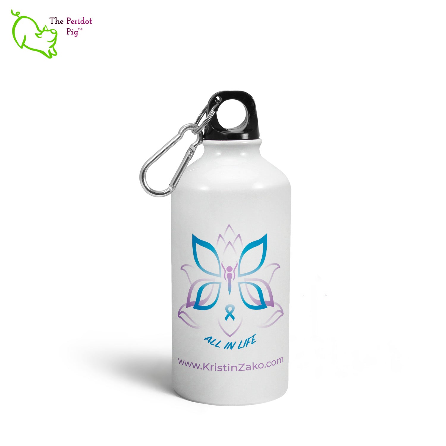 A perfect reminder to focus on the four pillars throughout the day while staying hydrated. This glossy white water canteen features Kristin Zako's logo on both sides. It has a screw top with a replaceable gasket and a carabiner to attach to your backpack.