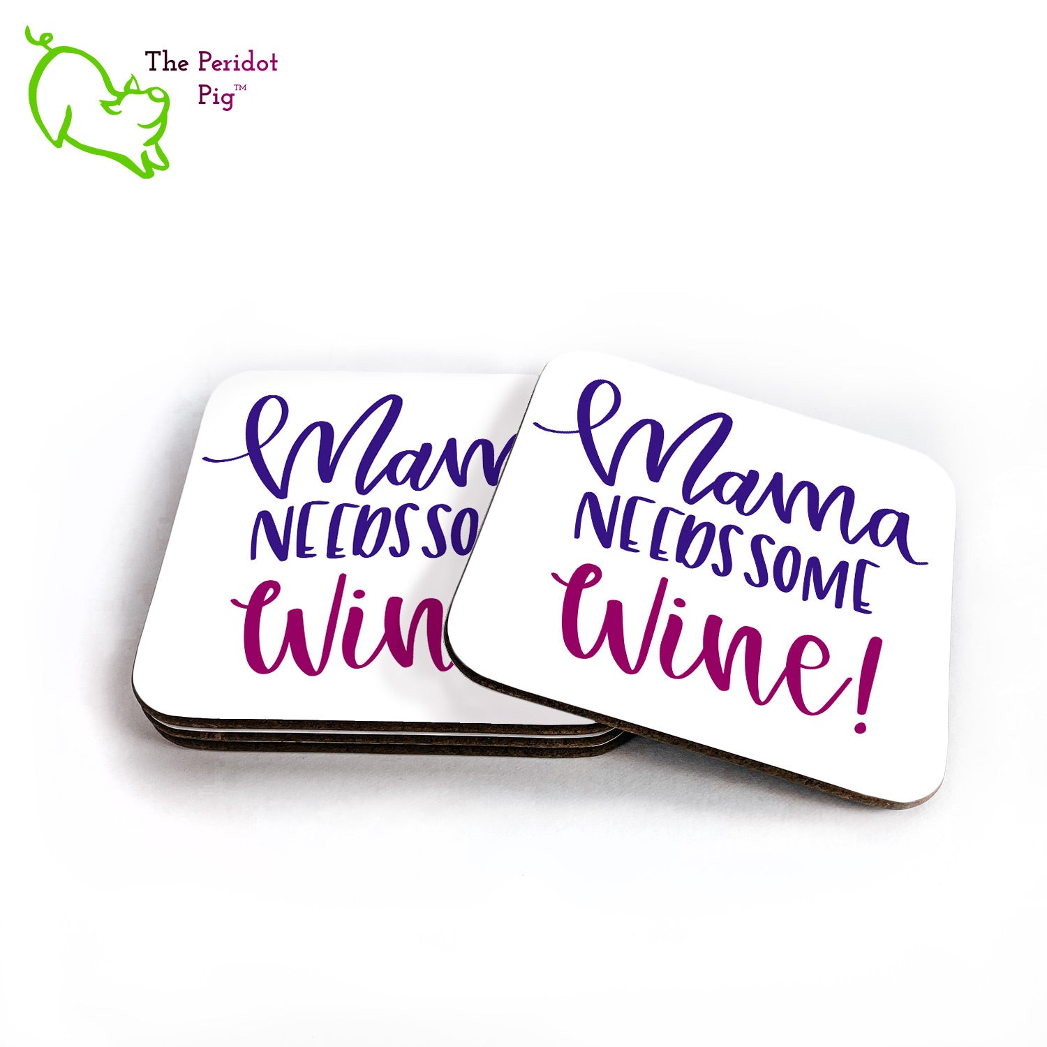 Sometimes the best gift is a dose of reality. This set of four square coasters is printed in bright colors on either a matte or a gloss coaster. They simply state that "Mama needs some wine" in bright purple colors. The coasters are printed in a durable ink that won't fade over time. Perfect for both hot and cold beverages.
