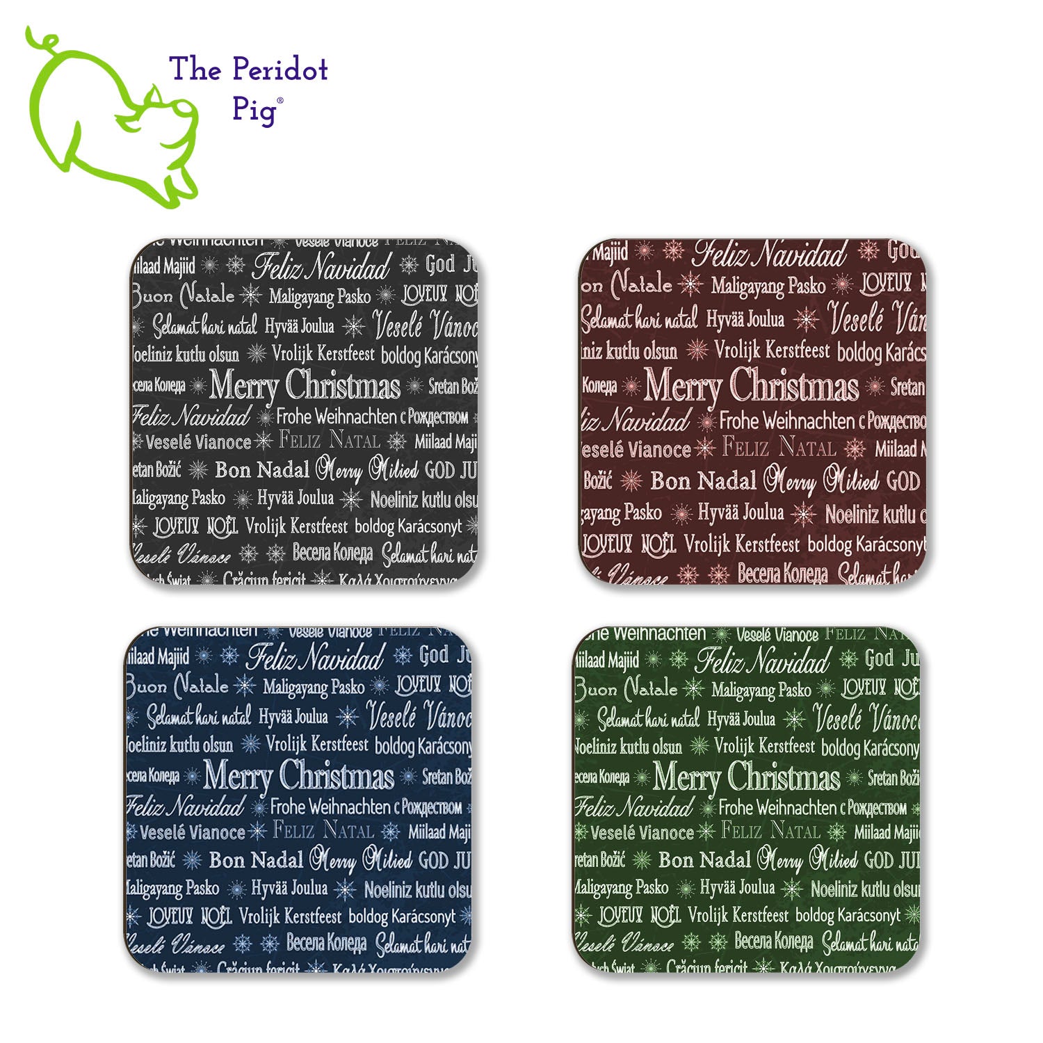 Have a Merry Christmas no matter where you are or where you're from! This set of four coasters is printed in bright colors on either a matte or a gloss coaster. They say, "Merry Christmas" in multiple languages. The coasters are printed in a durable ink that won't fade over time. Perfect for both hot and cold beverages. Available in gloss or matte finish. You can choose a mix of the four colors, red/green, or all four in a single color.