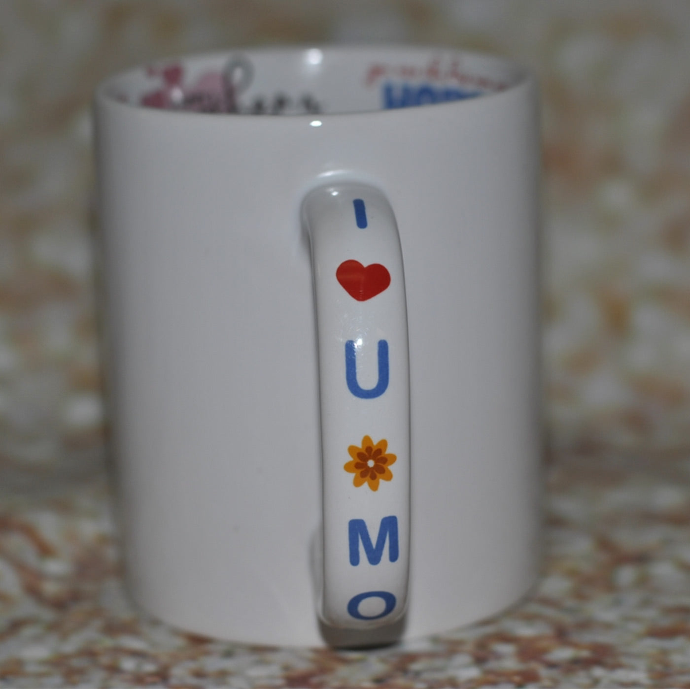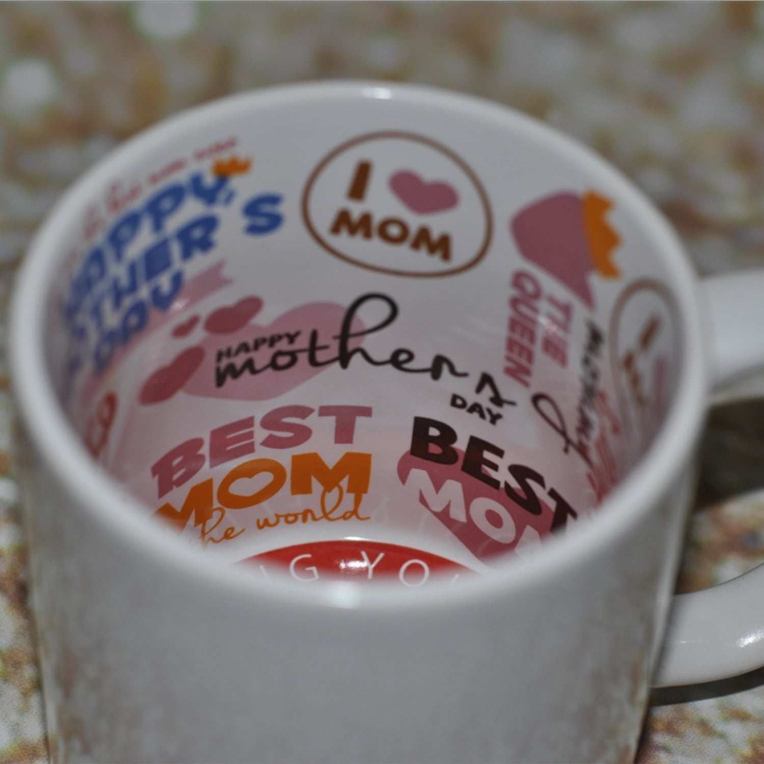 The "Mother's Day" mug option has "Happy Mother's day" printed all over the inside and the bottom of the mug. Along the handle, it also says "I -heart- U Mom" in colorful letters.