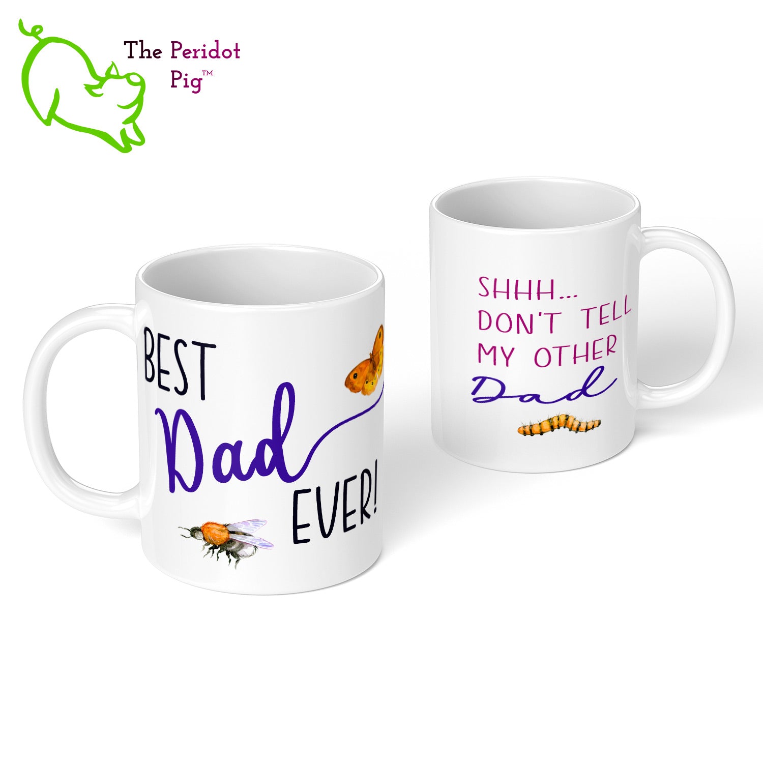Whether you have two dads or four, this fun little mug is the perfect gift. Celebrate Father's day with a gift that embraces a modern family! The mug says, "Best Dad Ever!" on the front. On the back, it says "Shhh...don't tell my other dad". Decorated in fun fonts with a cute little bee, moth and caterpillar.