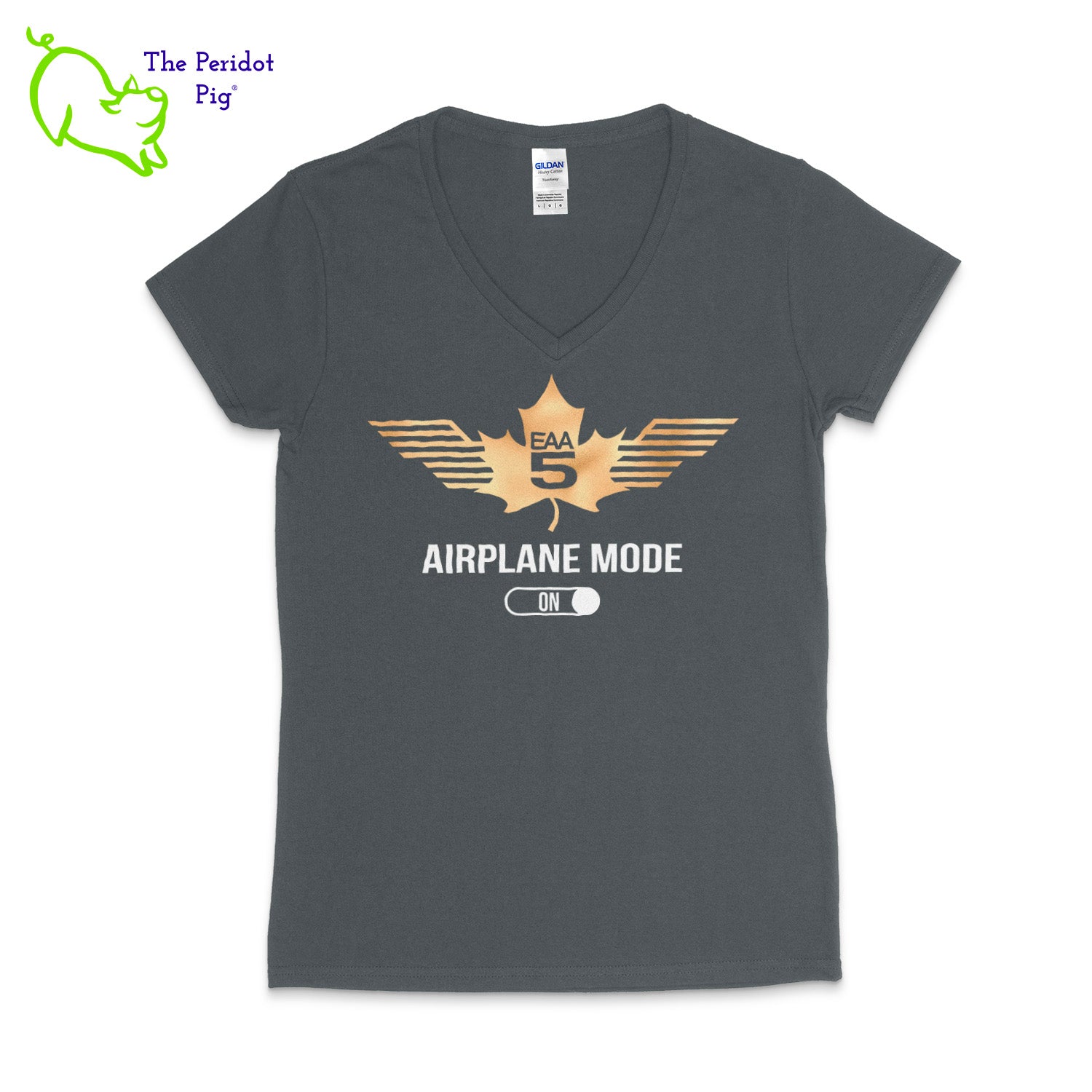 Crafted from a soft and comfortable material, this t-shirt features a slimmer cut, v-neck collar style. The text reads, "Airplane Mode ON" and the EAA Chapter 5 logo in either silver or gold. You can chose from five different colors for the shirt.