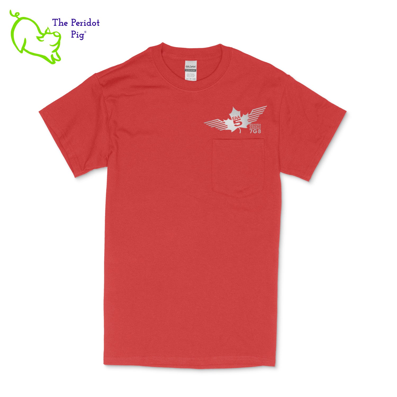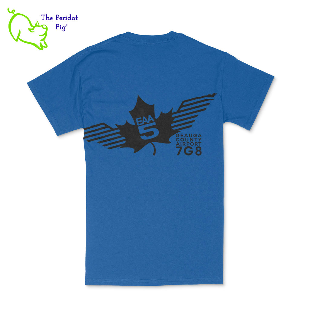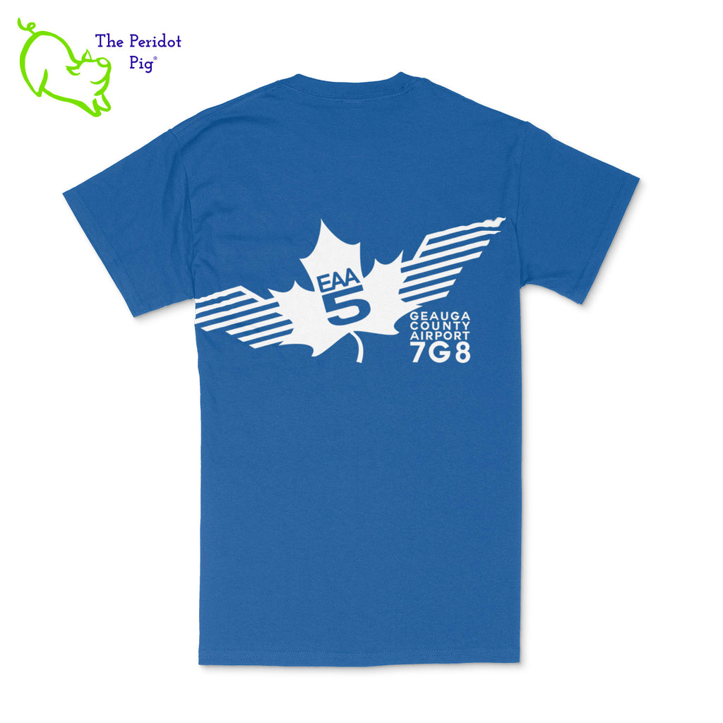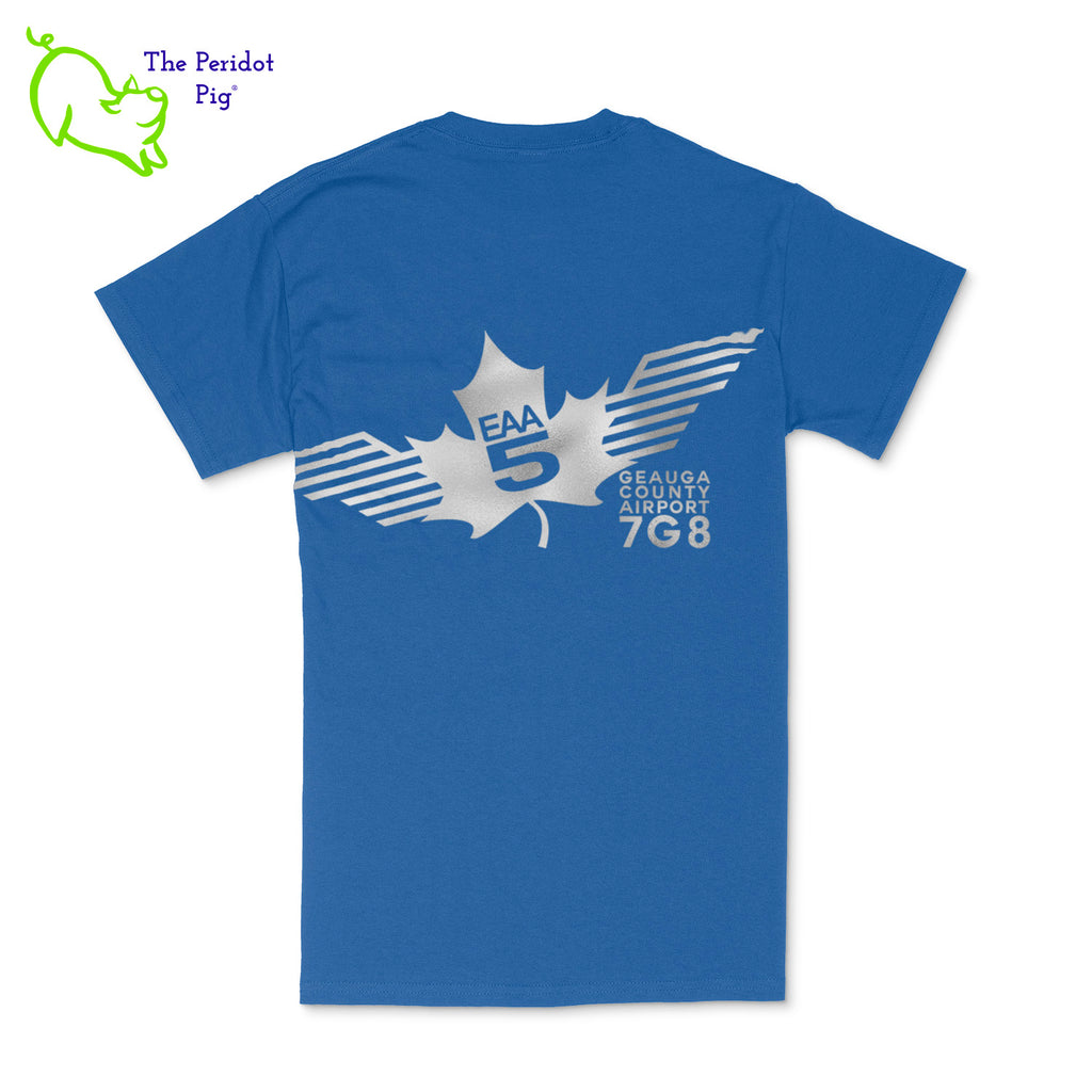 Crafted from a soft and comfortable material, this t-shirt features a loose cut, a front pocket and the EAA Chapter 5 logo in your choice of color on the front and back. You can also chose from four different colors for the shirt. The front logo is small and sits over the pocket. The back logo is larger and wraps around the back of the shirt.