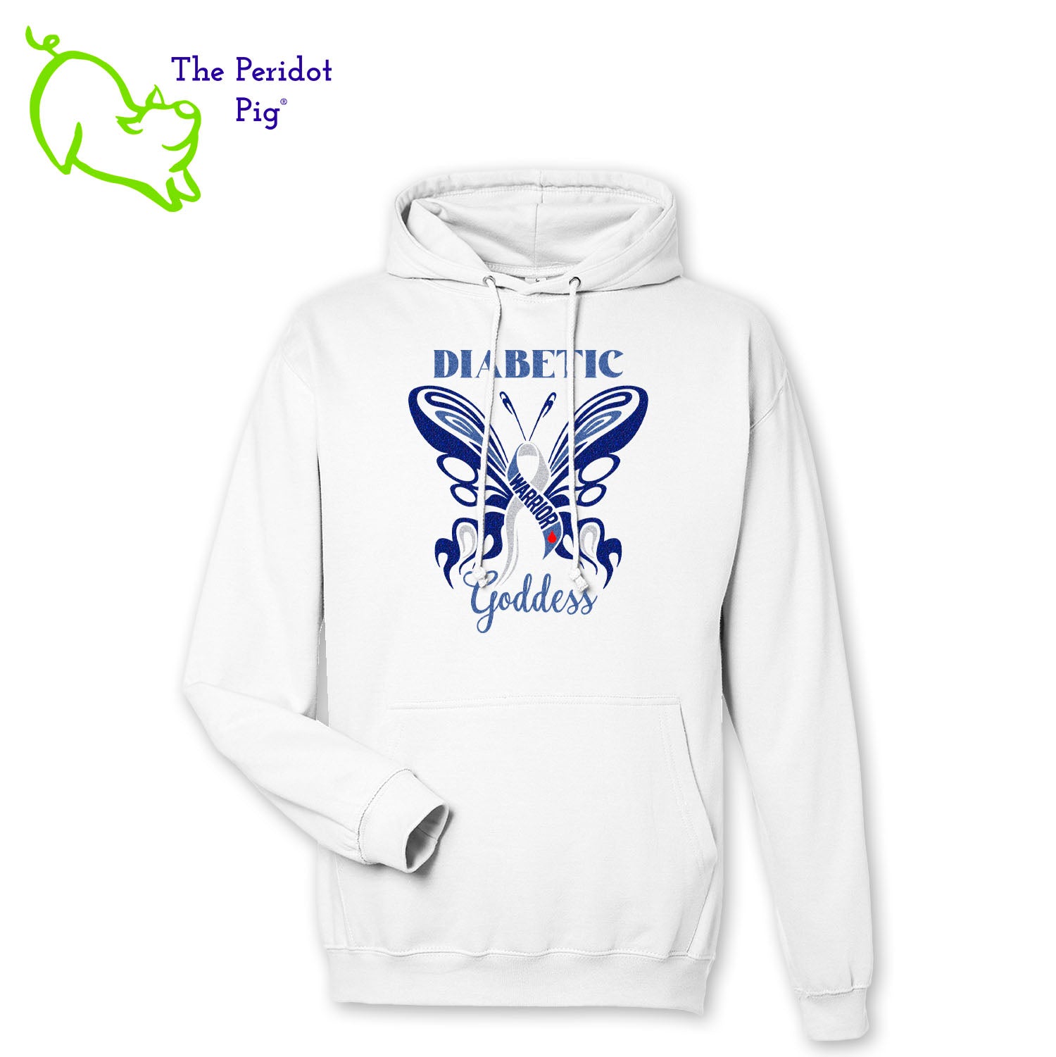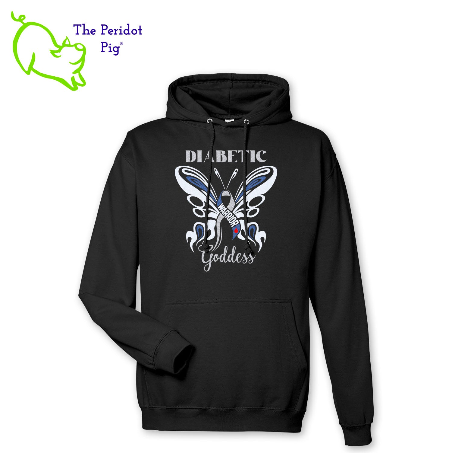 Fall is here and we need some warm gear! These hoodies are now available to celebrate November being National Diabetes Month. Here's a medium-weight comfy pullover hoodie featuring the words "Diabetic Warrior Goddess" and the Diabetes Type 1 ribbon surrounded by a stylistic butterfly on the front. The image is crafted in dark blue holographic vinyl with white, silver and light blue glitter as well. The turquoise version has a gray contrasting hood interior and gray strings.