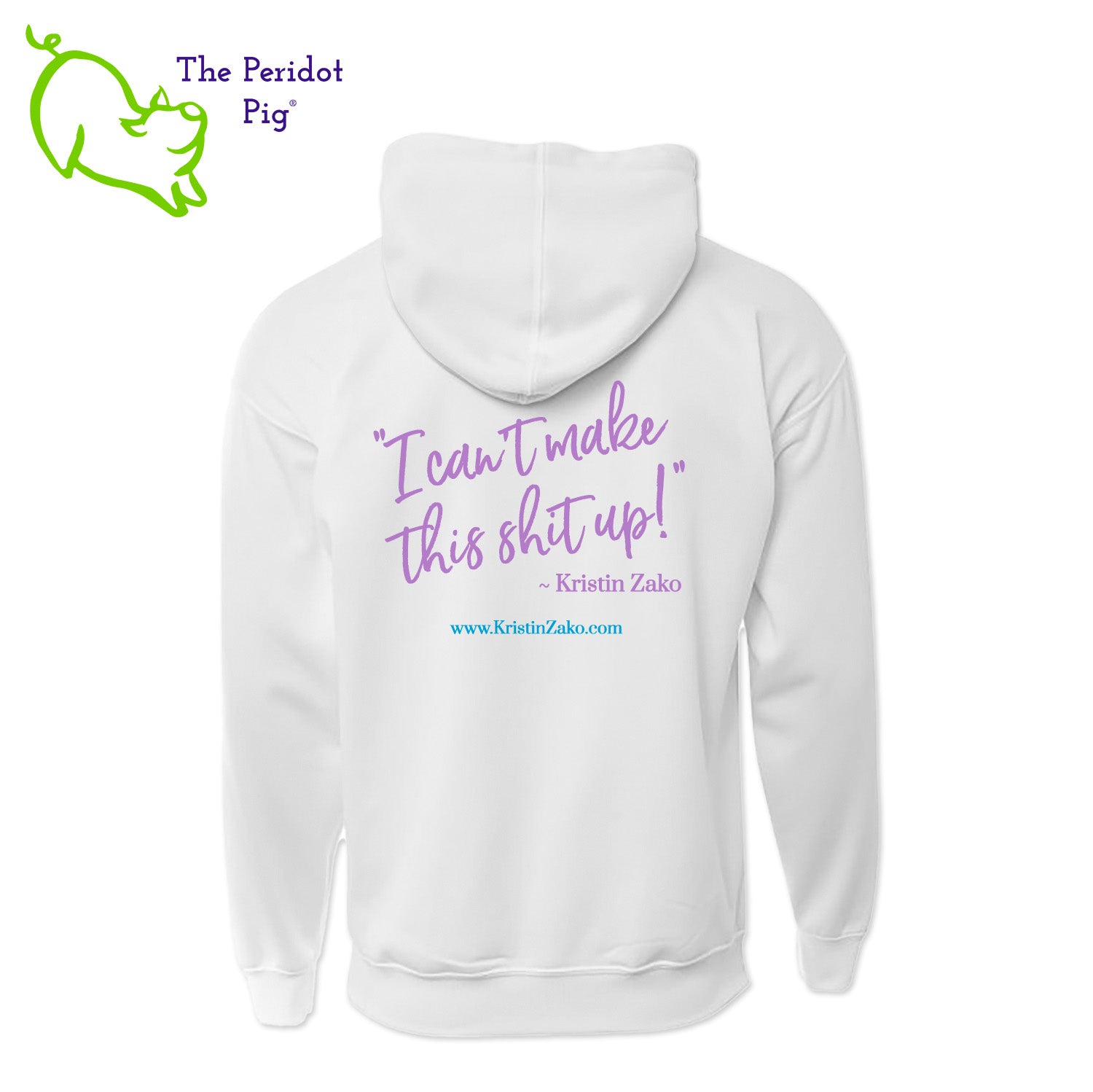 Kristin is always saying, "I can't make this shit up" and we had to put that on a nice performance hoodie. These medium weight hoodies are made from a performance polyester that is very soft. The print is a vivid sublimation print that won't crack or fade over time. The front sports her logo on the left chest area. The back has the "I can't make this shit up" quote and her website URL.