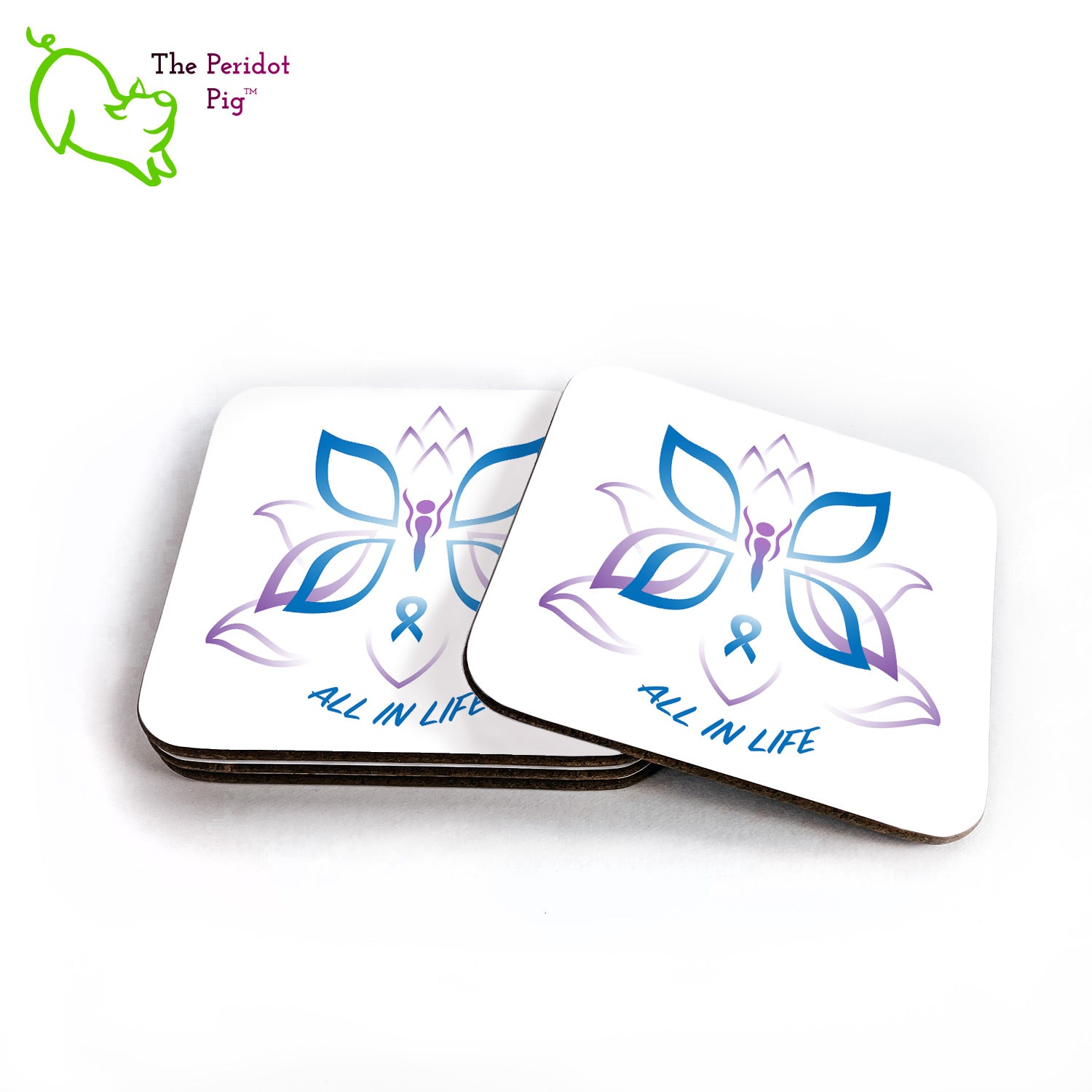 This set of four square hardboard coasters is printed with Kristin Zako's All in Life logo. Each coaster is individually printed with a bright glossy white finish. These coasters will hold up well with either hot or cold beverages.