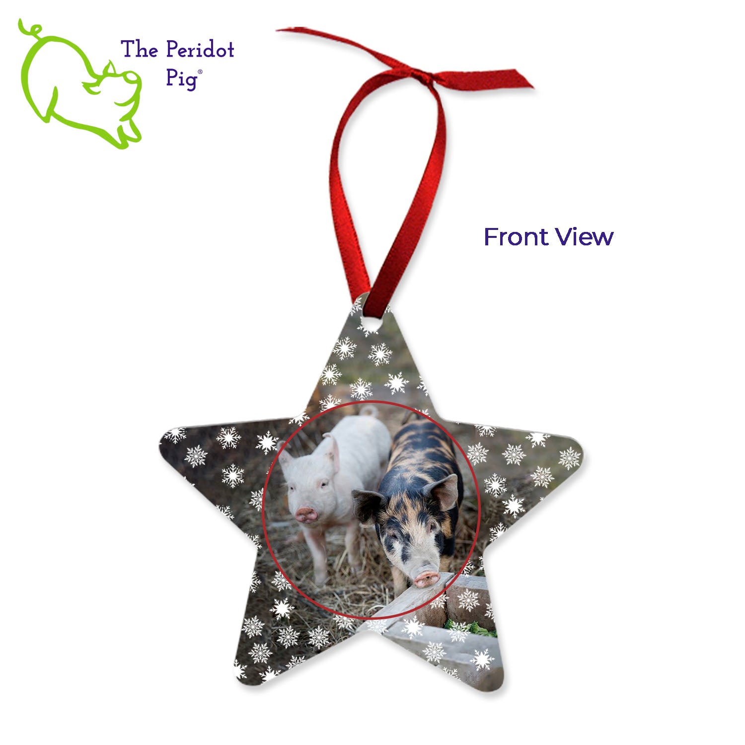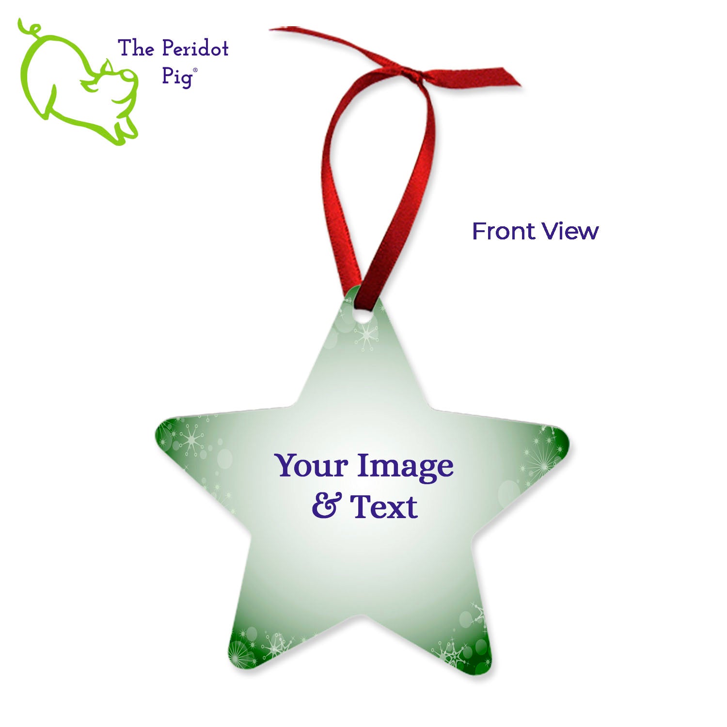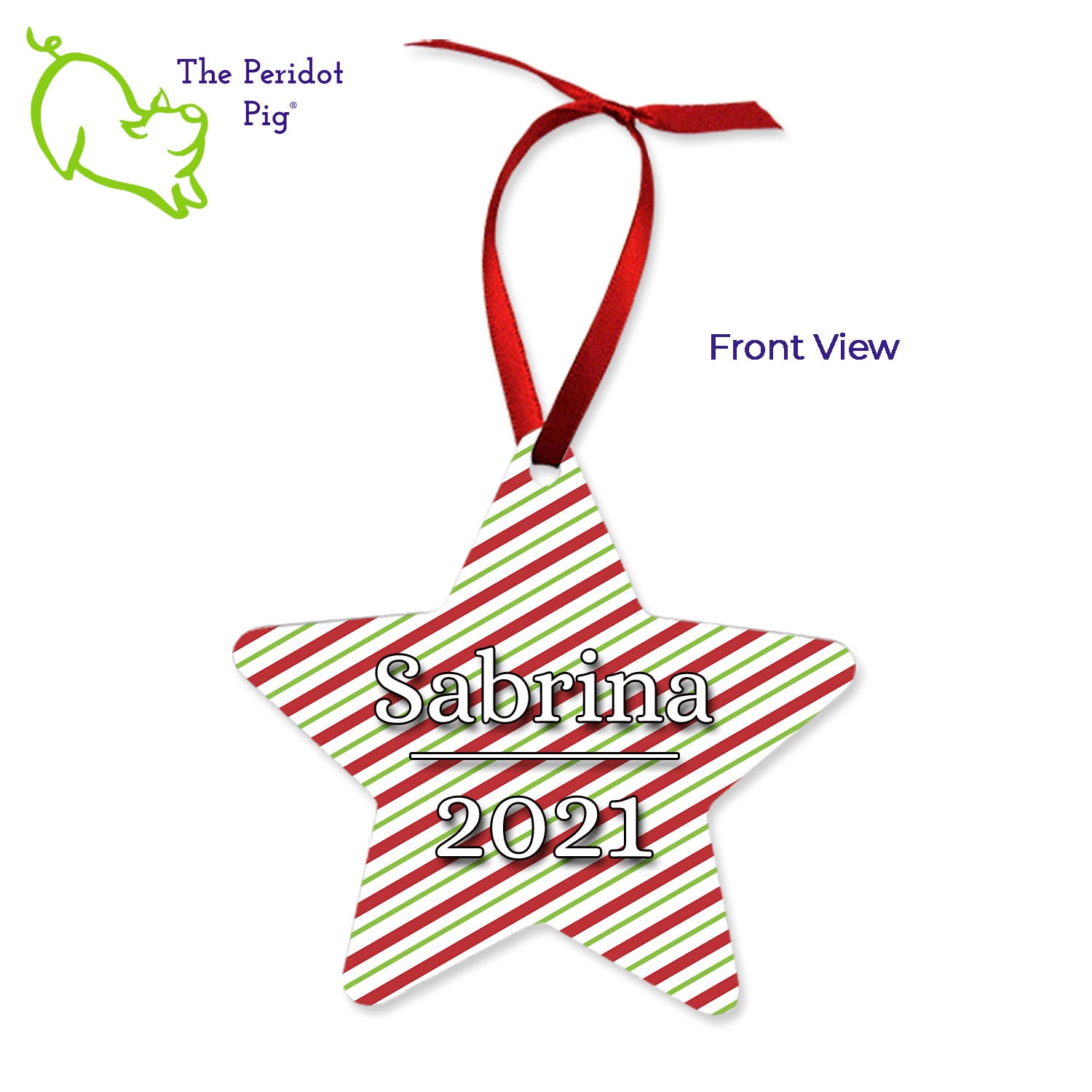Create a beautiful keepsake ornament for the holidays! These aluminum ornaments can be printed in vivid color with the photo or artwork of your own choice. Both sides can be customized. The ornament is light weight for hanging on the tree and comes with a ribbon hanger. This ornament is perfect for the star in your life. We've shown them here with the name and year on the back with a fun Christmas candy stripe pattern. On the front, choose from 5 different border styles. This style is best with the text on the back but we can customize it in many different ways.