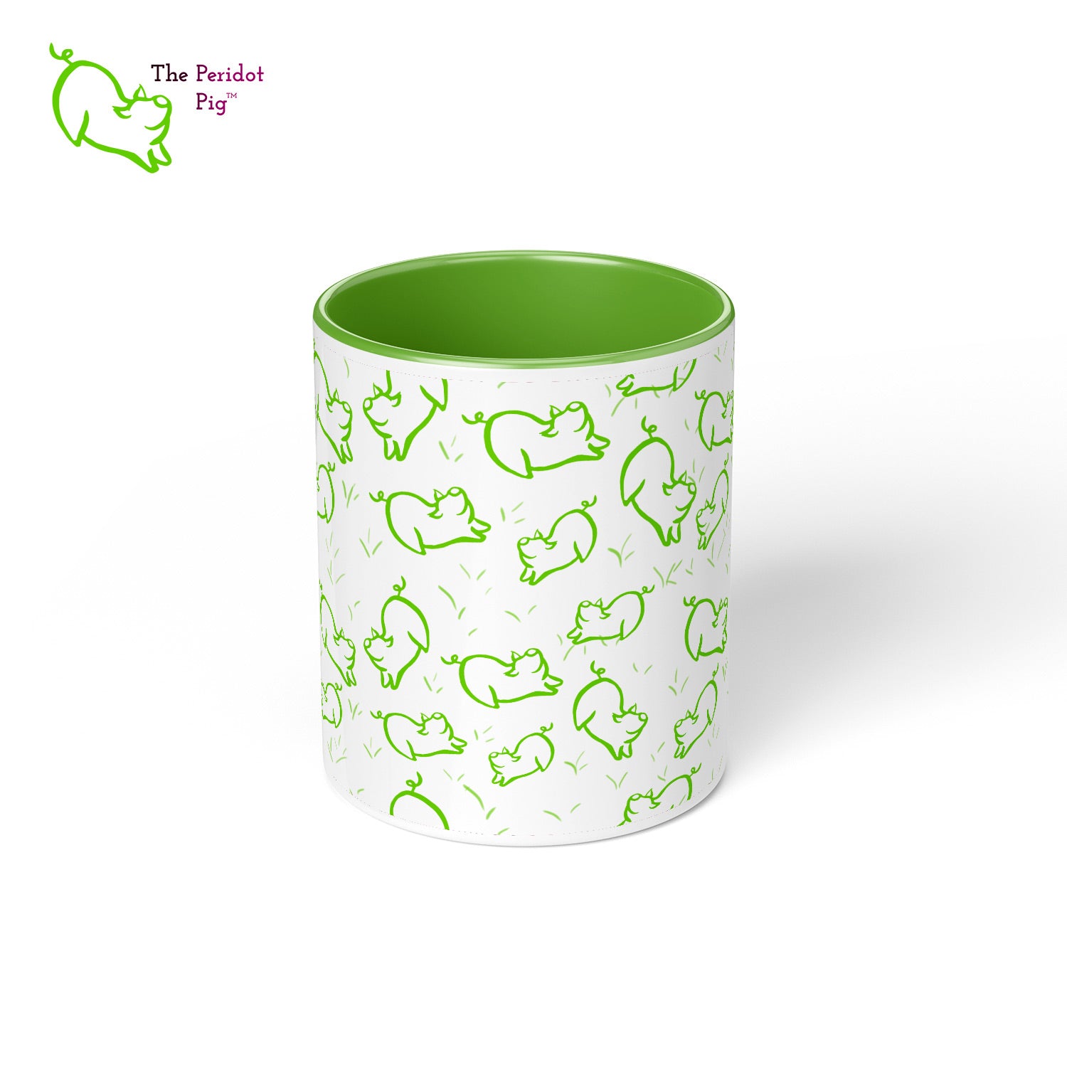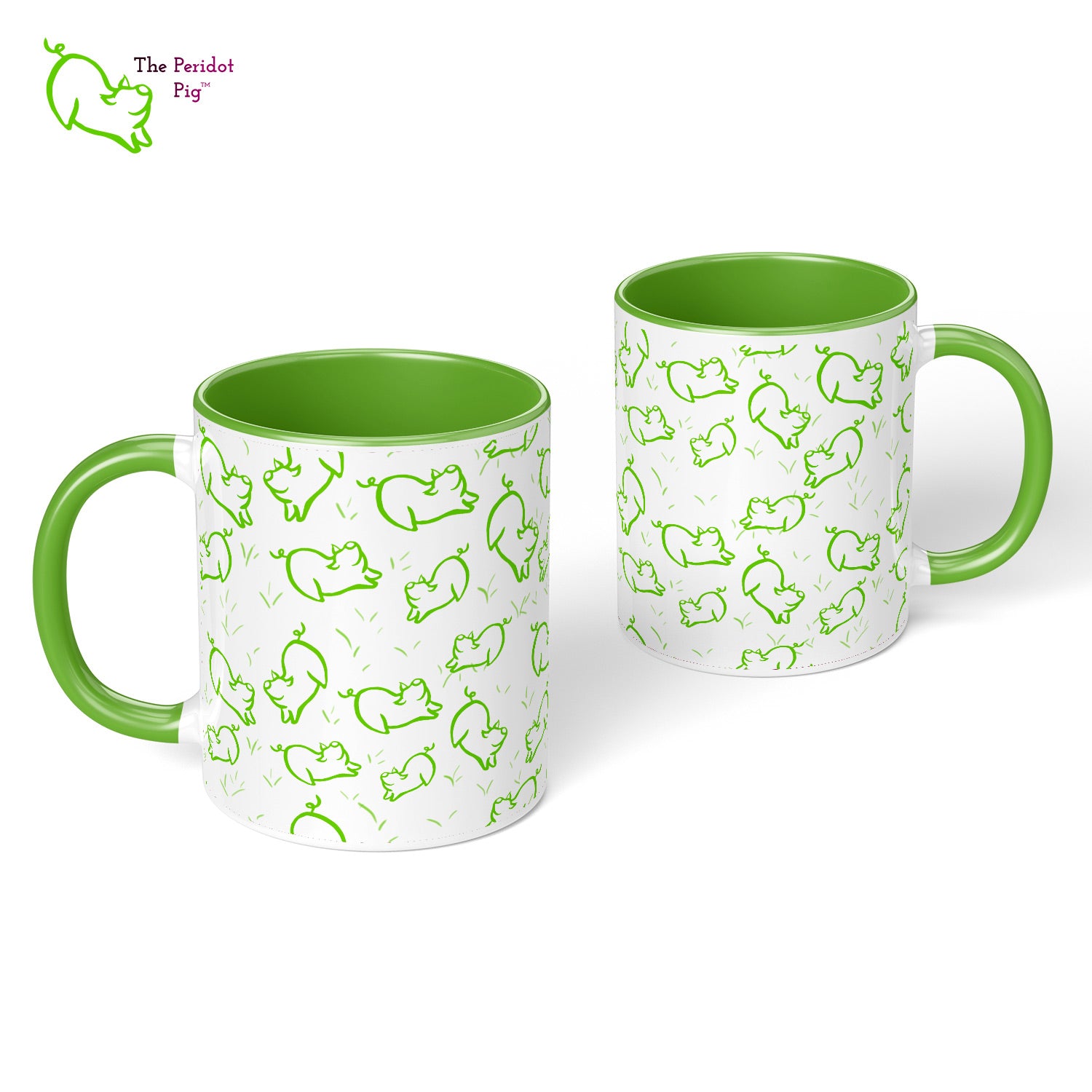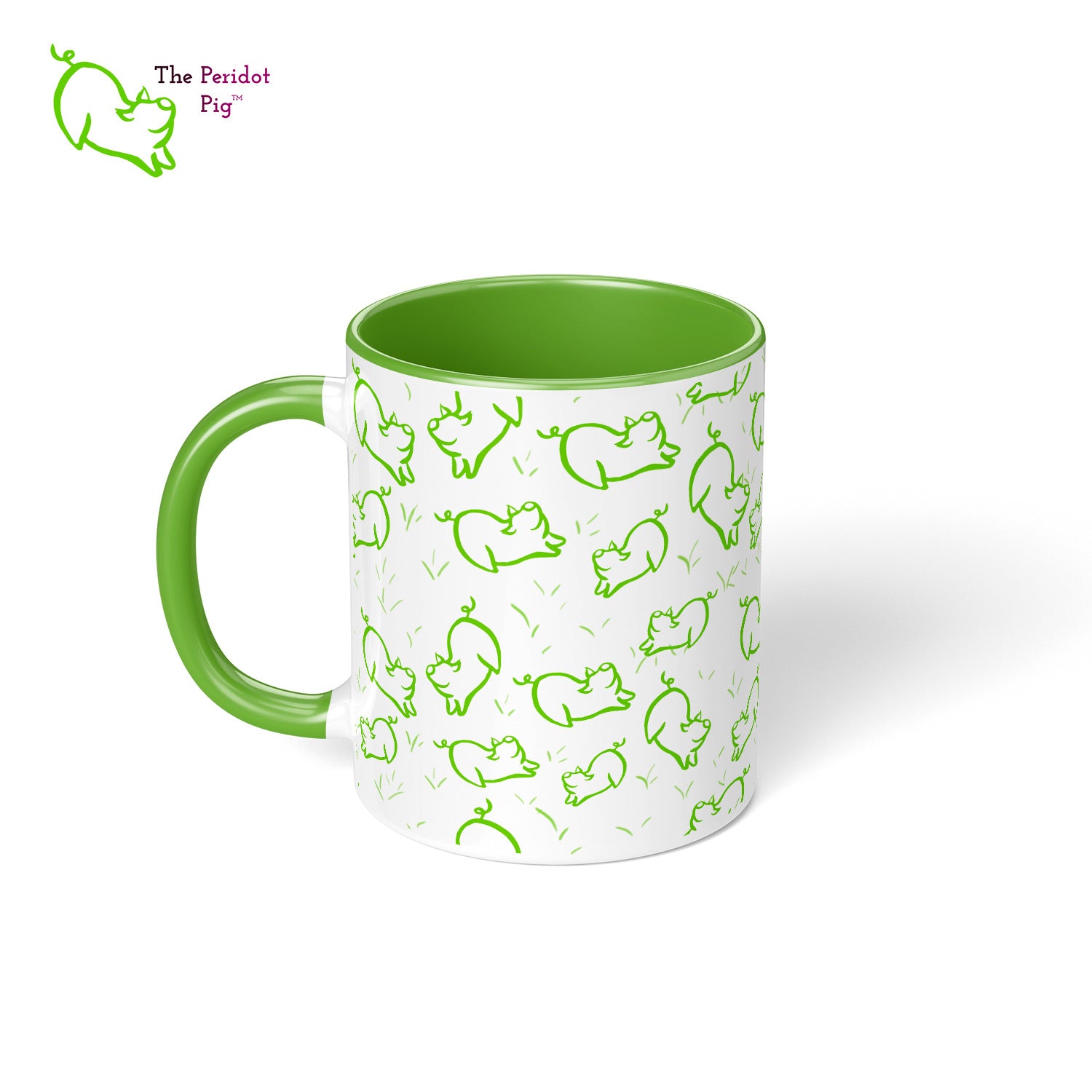 Peri's perky little peridot self is frolicking across this mug. Frolicking so much that you have to call it dancing a pig jig. This bright green mug is sure to brighten the start of your day.