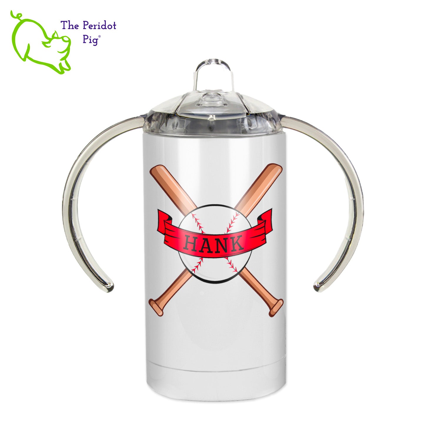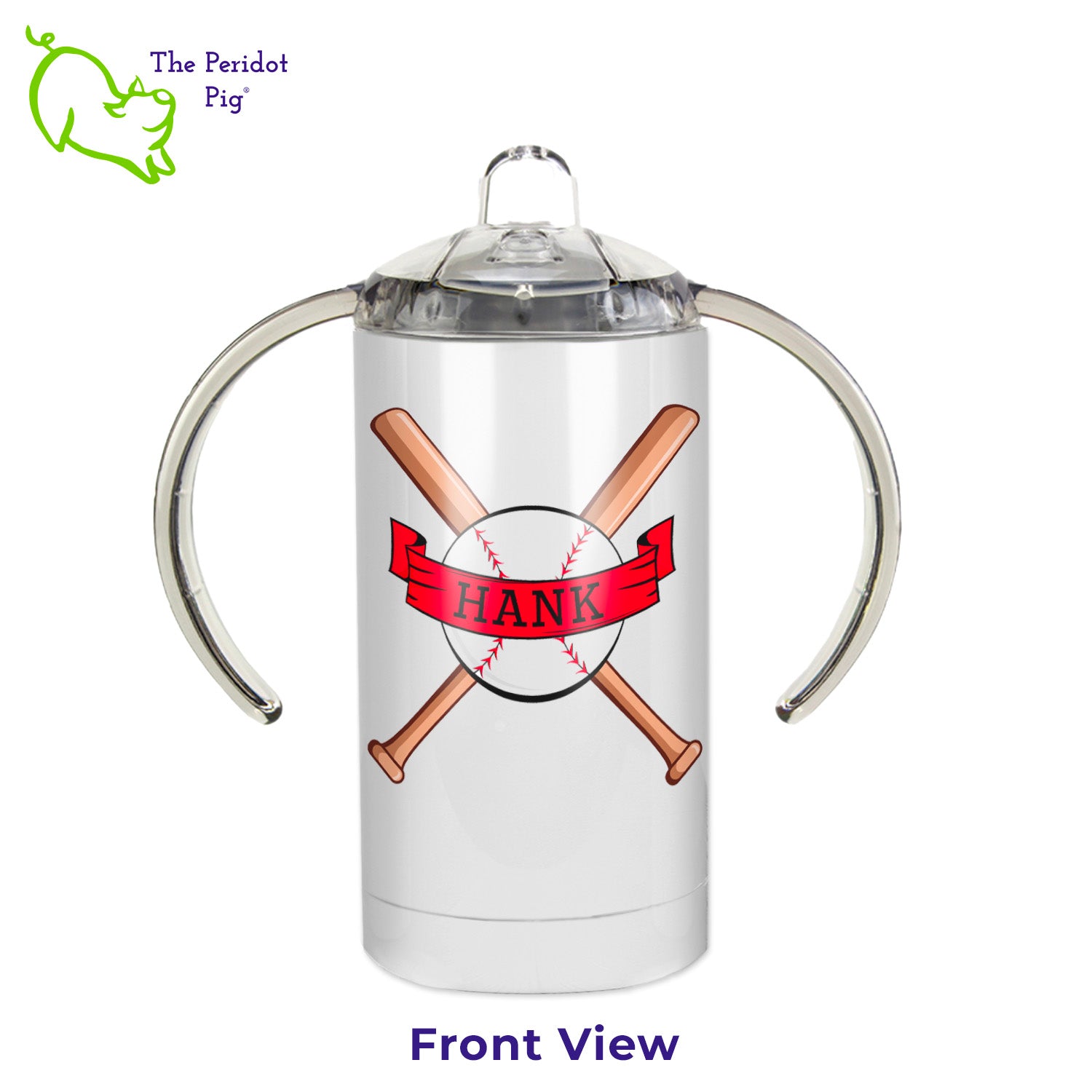 The perfect gift for baseball fan, new parents! Add the baby's name to this cute baseball themed sippy cup. These cups print beautifully in vivid color. We'll add their name in the bright red banner on both the front and back.