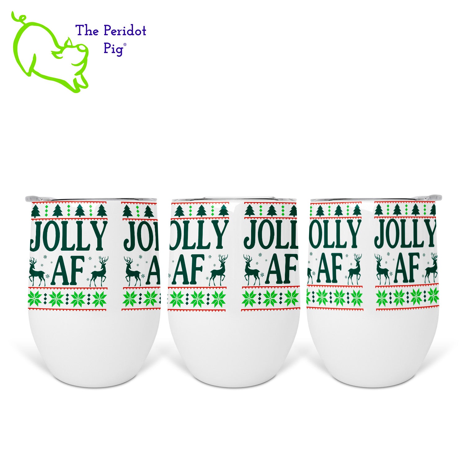 Shhh....we won't tell your mother-in-law what it means. Enjoy this fun tumbler and see if they finally ask. Printed in bright color on an insulated wine tumbler, it's perfect for the winter holidays! The print is all the way around the tumbler. It is a stylized sweater print with reindeer and the words, "Jolly AF".
