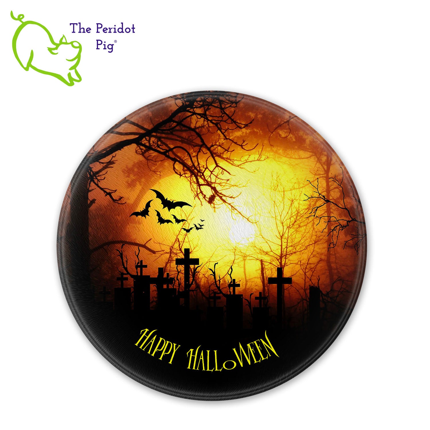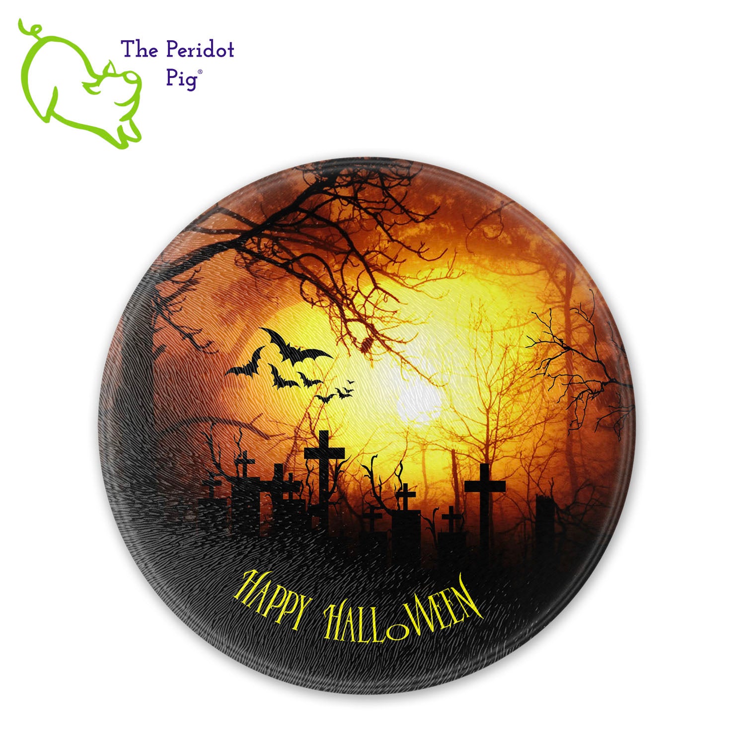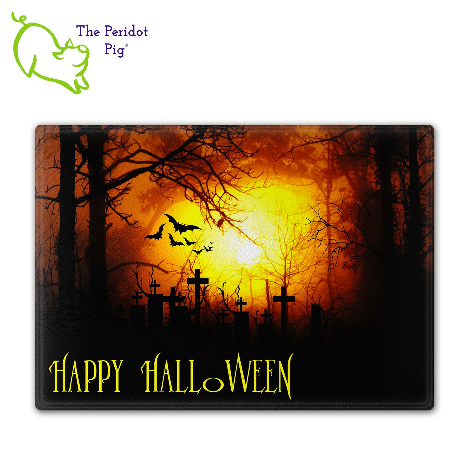 How about a Halloween cutting board for your next party? These make a perfect birthday, holiday or house warming gift! We've designed these with a dark graveyard scene. "Happy Halloween" is printed in a bright orange. They are printed in permanent sublimation colors that are vivid and bright.